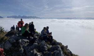 Ein traumhafter Rundblick bis zu den großen Gipfeln Venediger und Glockner, nebenan Wendelstein und Wilder Kaiser, unter uns eine dicke weiße Watteschicht und über uns ein strahlend blauer Oktoberhimmel. Eigentlich wollten alle dort bleiben, aber es lockte ja der gut versicherte Klettersteig mit Stufen, Seilen und einem Tunnel für Nicht-Dicke. Besonders die Kids hatten ihre Freude beim Herunterklettern und der Tunnel löste allgemeine Begeisterung aus.