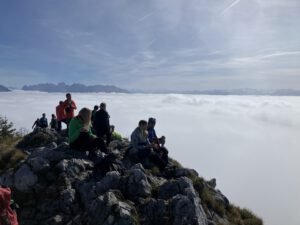 Ein traumhafter Rundblick bis zu den großen Gipfeln Venediger und Glockner, nebenan Wendelstein und Wilder Kaiser, unter uns eine dicke weiße Watteschicht und über uns ein strahlend blauer Oktoberhimmel. Eigentlich wollten alle dort bleiben, aber es lockte ja der gut versicherte Klettersteig mit Stufen, Seilen und einem Tunnel für Nicht-Dicke. Besonders die Kids hatten ihre Freude beim Herunterklettern und der Tunnel löste allgemeine Begeisterung aus.