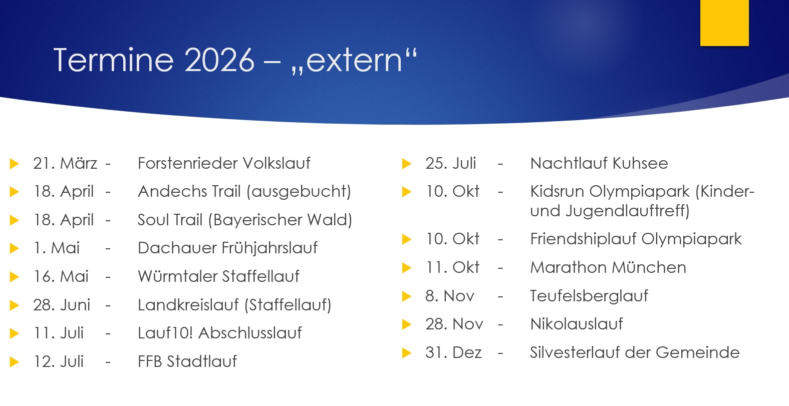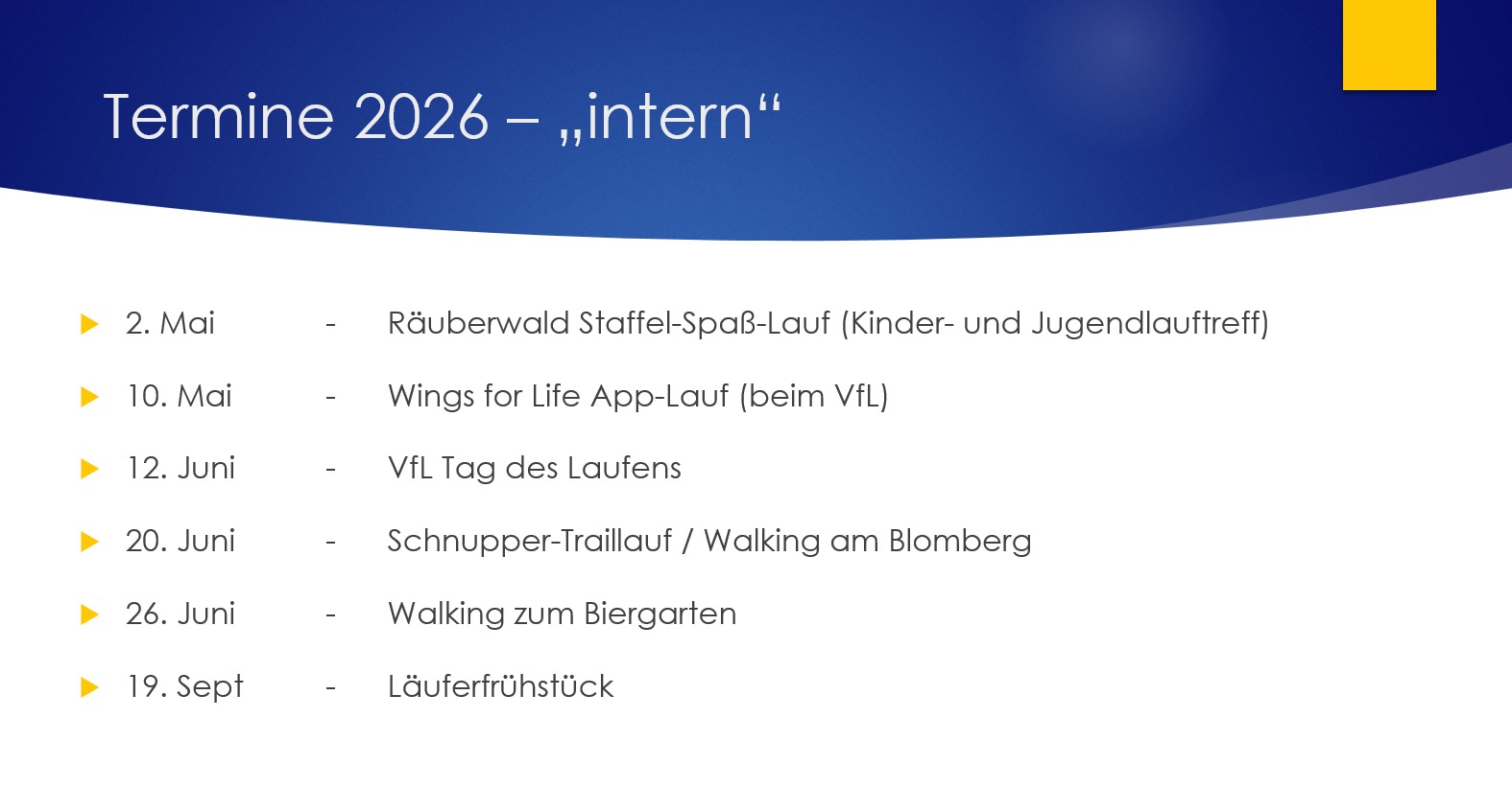Abschließend wurde ein Ausblick auf das Läufer-Jahr 2026 gegeben. Neben bewährten Wettkämpfen und gemeinsamen Veranstaltungen stehen bereits wichtige Termine wie z.B. der Wings-for-Life-World Run oder auch der Tag des Laufes im Kalender, auf die sich die Mitglieder freuen dürfen. Ziel bleibt es, sowohl sportliche Erfolge zu erzielen als auch den Gemeinschaftsgedanken weiter zu stärken.