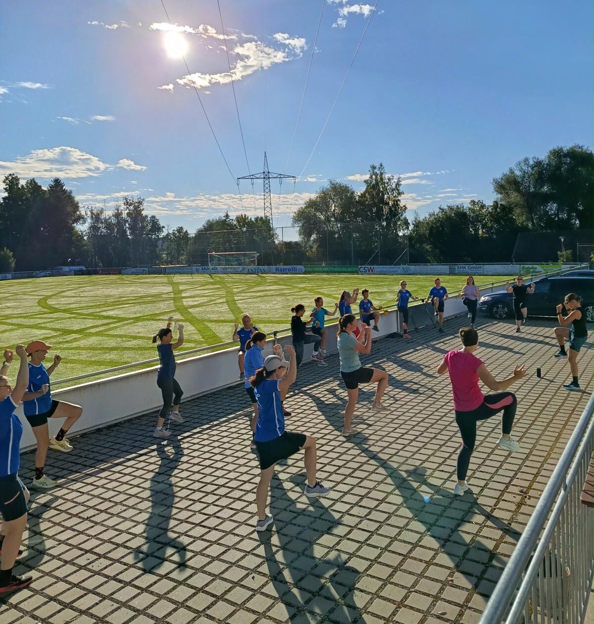 Um 9 Uhr trafen sich 17 Teilnehmer zu einem Warmup bei strahlendem Sonnenschein und italienischen Hits im Hintergrund.